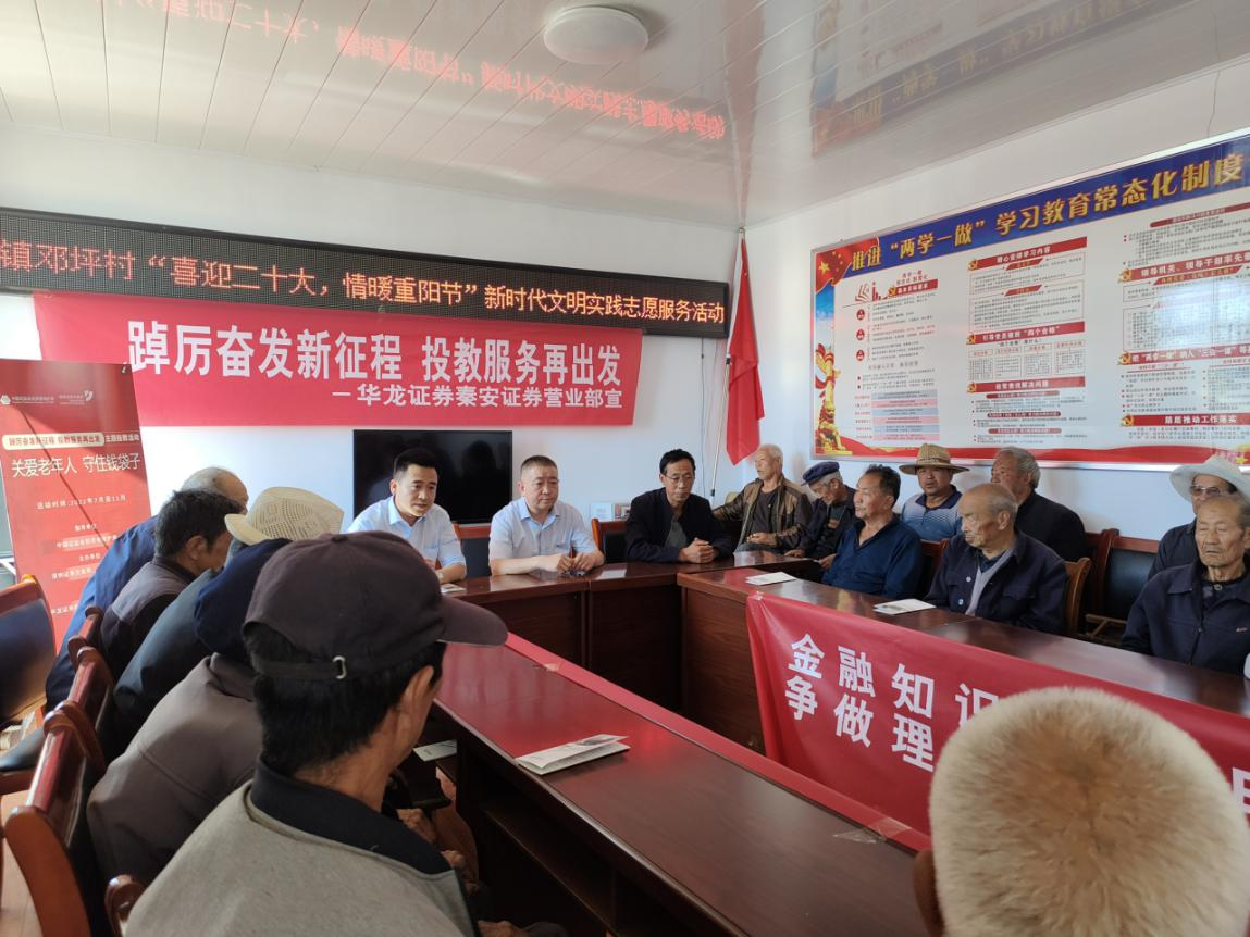 为迎接党的二十大胜利召开,筑牢资本市场高质量发展基础,根据深交所《关于组织开展“踔厉奋发新征程 投教服务再出发”主题投教活动的通知》要求,鉴于近年来金融诈骗案件层出不穷,老年人群体又是易受害群体之一,在甘肃证监局、华龙证券投教基地的指导下,结合金融知识普及月投教宣传活动,华龙证券秦安营业部深入农村,与秦安县刘坪镇邓坪村委会联合开展了主题为“关爱老年人、守住钱袋子”的金融知识讲座。