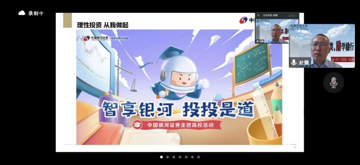 为保护投资者合法权益,有效防范化解金融风险,巩固树立理性价值投资理念,中国银河证券甘肃分公司根据甘肃证监局、甘肃证券期货业协会及公司“金融知识普及月”活动要求,结合公司“2022智享银河 投投是道”走进高校系列活动,在与甘肃开放大学校企合作的良好基础上,于9月26日进行了一场以“防范非法证券期货陷阱”为主题的线上讲座。