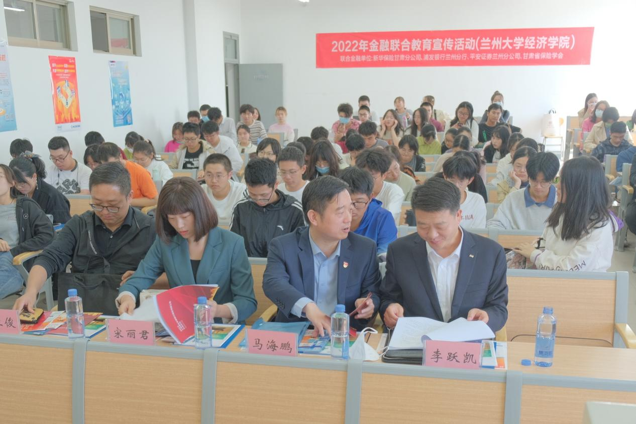 为响应甘肃证监局2022年“金融知识普及月 金融知识进万家 争做理性投资者 争做金融好网民”宣传教育活动,积极落实投资者教育责任,加强高校学生金融知识普及,2022年9月29日,平安证券兰州分公司、浦发银行兰州分行、新华保险甘肃分公司共同举办“2022年金融联合教育宣传活动-走进兰州大学”。平安证券兰州分公司总经理宋丽君,浦发银行兰州分行党委书记、行长李跃凯,新华保险甘肃分公司党委书记、总经理郭立俊一行以及兰州大学120余名师生参加本次活动。