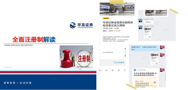 2023年2月1日,中国证监会就全面实行股票发行注册制主要制度规则向社会公开征求意见。上交所、深交所分别发布就全面实行股票发行注册制配套业务规则公开征求意见的通知,全面注册制改革正式拉开序幕,此消息一出立刻引起市场关注。根据普通投资者提出的诸多问题,2月4日早,金昌昆明路营业部特举行了一系列关于“全面注册制改革”为主题的线上线下投资者教育活动。