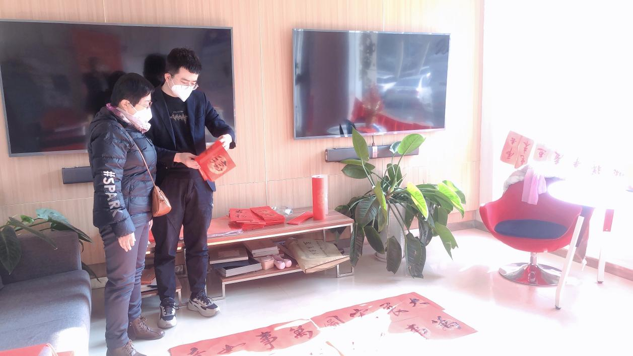 营业部特邀甘肃省书法协会老师现场挥毫泼墨,为投资者免费送春联,送祝福。投资者韩女士看着书法老师刚刚写好的一副春联乐呵呵的说:“现场书写的春联更有中国传统文化特色,喜庆,很高兴能带份祝?;厝?。”