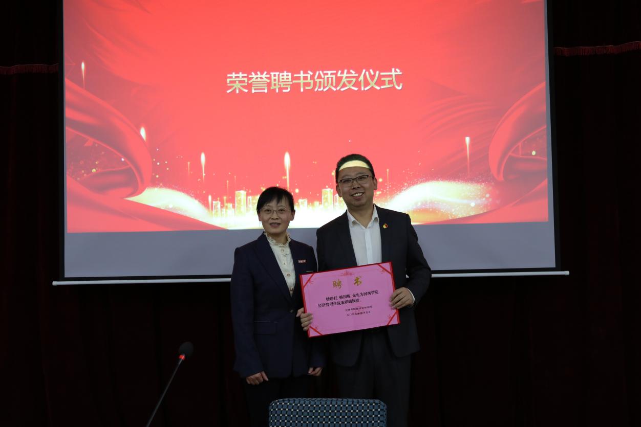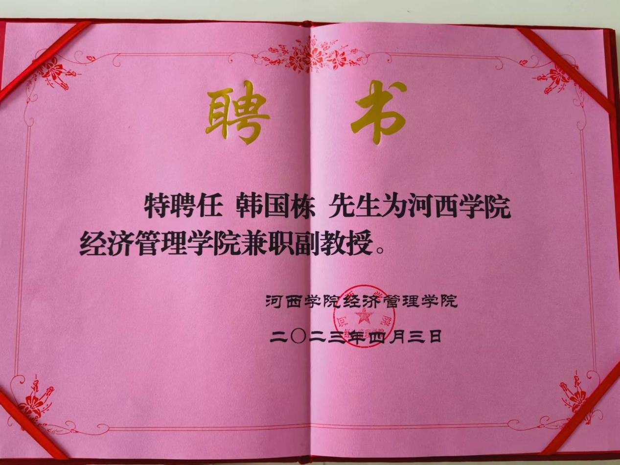 河西学院经济管理学院党支部书记特此为营业部总经理颁发聘书,特聘请韩国栋先生担任经济管理学院“兼职副教授”为高校大学生定期开展金融知识讲座和投资理财专业课程的讲解。