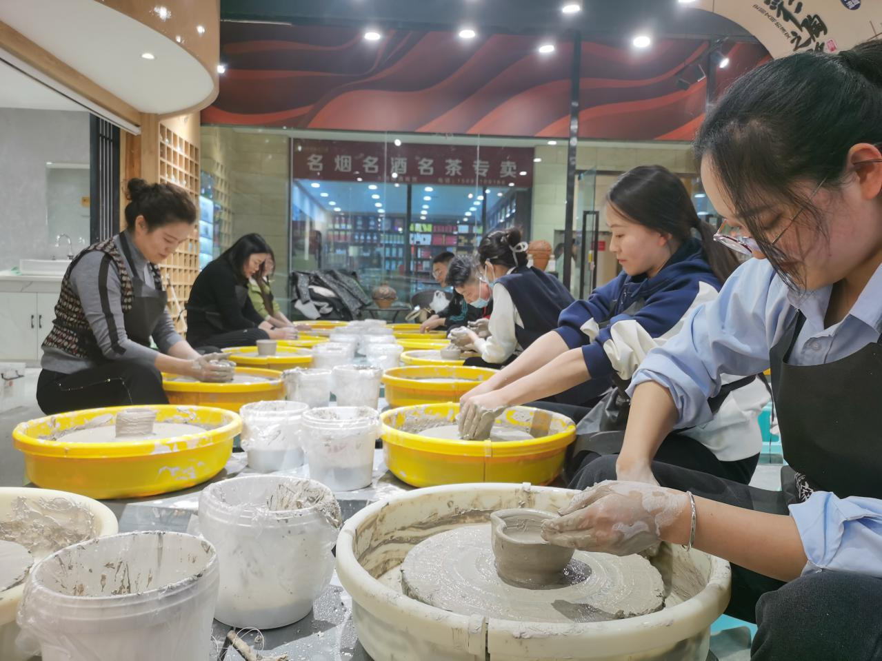 陶泥,是中国传统文化和现代艺术结合的新方式,手工陶艺DIY讲究心手合一,要有耐心、细心,通过老师简单的讲解及现场演示后,大家纷纷撸起袖子,发挥自己的想象力,在陶艺老师的指导和辅助下,一个个精致的小花瓶、杯子渐渐成型。