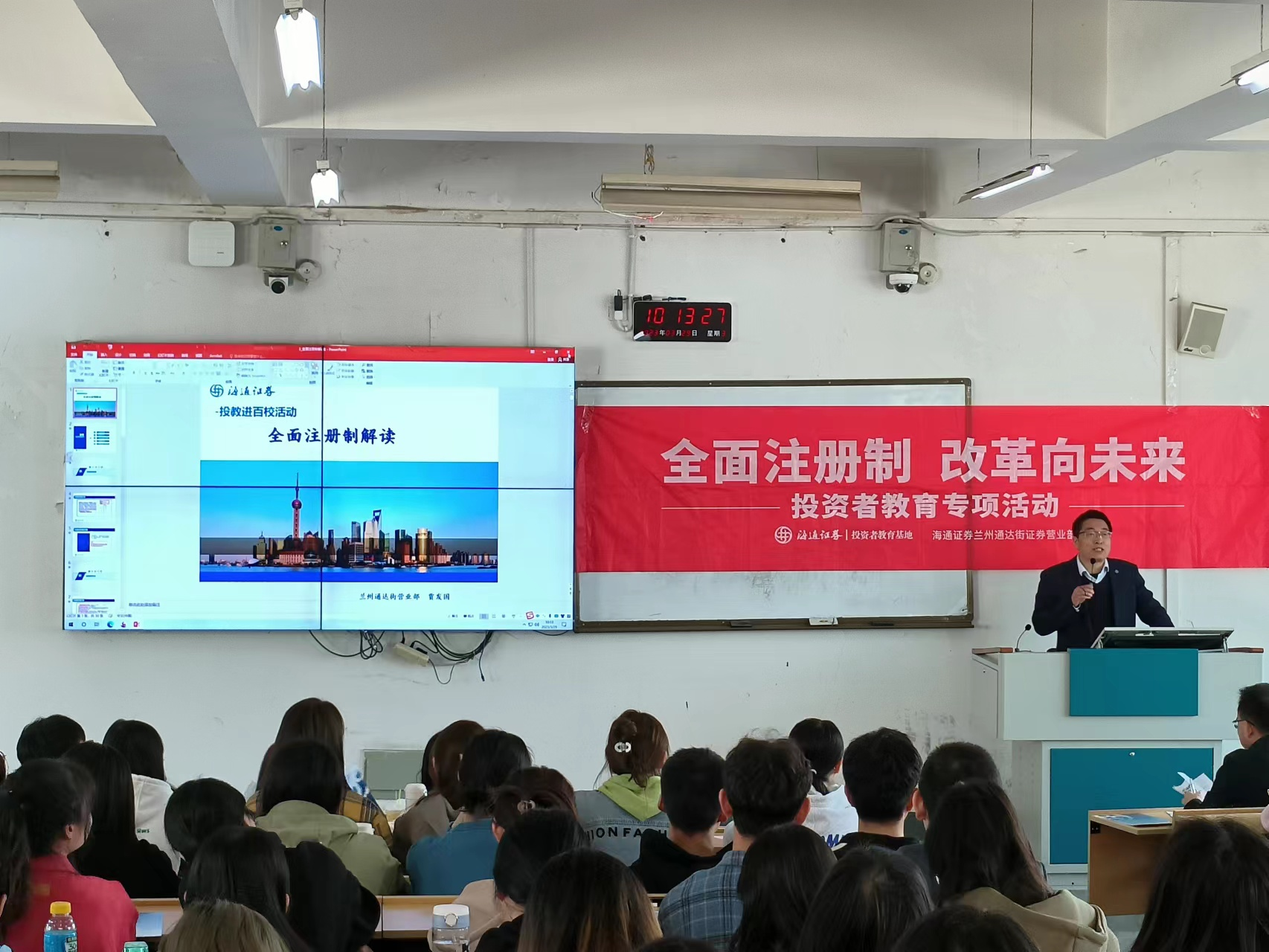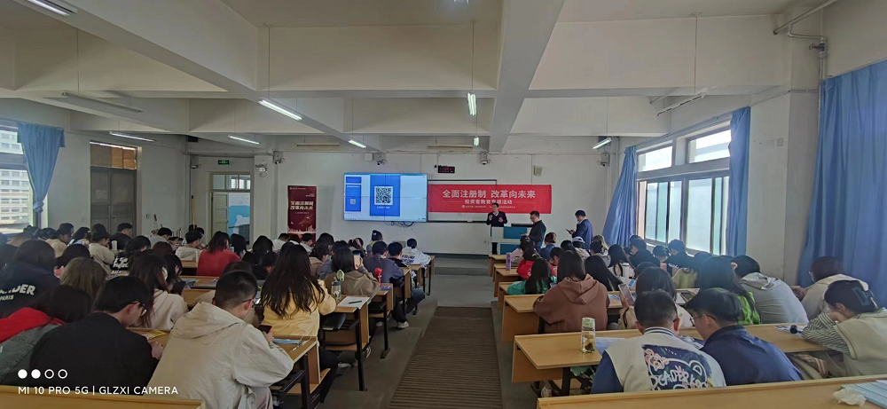 2023年2月17日,我国正式开启全面发行注册制,这是资本市场改革的重大事件,为了及时普及相关知识,推进全面注册制宣传工作,投资者教育势在必行。为此,营业部走进甘肃农业大学,由营业部投资顾问面向该校经济学院120余名大学生开展了“全面注册制,改革向未来”为主题的专题讲座。从注册制的发展历程、交易规则、重要意义及影响以及风险揭示等几个方面展开,详细深入的向高校师生阐述了全面注册制相关业务知识。同时,工作人员向在座师生发放全面注册制宣传彩页100余份,在互动环节邀请师生参与全面注册制扫码答题;此外针对同学们关注关心的金融热点问题、就业导向等问题进行了问答互动,现场气氛热烈。