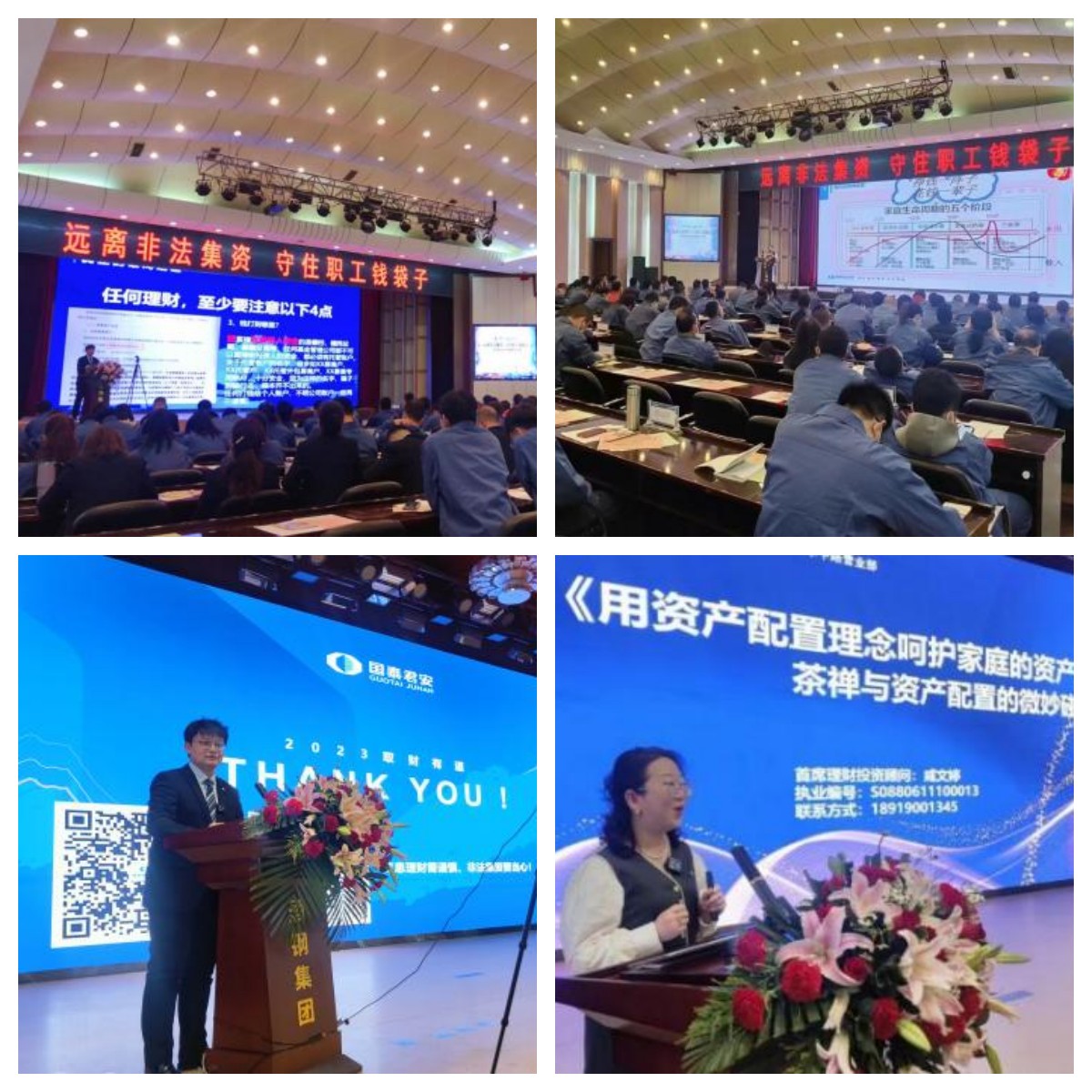 此次投教讲座的目标旨在提升风险防范意识和识别能力,引导全体职工树立科学多维度的投资理念,养成理性易操作的配置方法。讲座分为三个部分,首先,由酒钢集团公司副总、法律顾问、审计风控法务部负责人徐强总对此次讲座的必要性和及时性做了高度的概括和肯定。希望参与线上线下的所有职工认清非法集资的犯罪手段,了解资产配置方法。其次,由国泰君安证券嘉峪关营业部总经理朱晖总阐述了国泰君安证券的近况和取得的突破,紧接着介绍了和酒钢集团合作的历史渊源,最后强调了会以此活动为契机,不断寻找深度合作机会,携手共创美好未来的愿景。接下来进入讲座环节,由专家投资顾问葛晖和首席理财投资顾问咸文婷以“一眼识破非法集资骗局”和“用资产配置理念呵护家庭资产”为题,围绕防范非法集资陷阱、电信网络诈骗和普及金融知识等重点内容,通过深入浅出的讲解,进一步增强职工法律风险防范意识,引导职工树立正确的投资理念,依法维护自身合法权益。最后,徐强总对此次讲座进行了总结和倡议。通过讲座介绍了常见的非法集资套路和以“高额利息”为诱饵的诈骗惯用伎俩,提醒企业员工投资要理性稳健、不要冒险,要警惕、不要盲目,并发放宣传手册提醒企业员工要珍惜“血汗钱”,拒绝高利诱惑,树立正确理财观,警惕非法集资陷阱,增强自我?;ひ馐?。