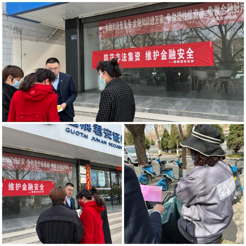 为贯彻落实公司关于开展防范非法集资、维护金融安全宣传月活动的相关文件精神,提高社会公众对非法集资的防范意识和识别能力,从源头上遏制非法集资,国泰君安证券嘉峪关新华中路营业部4月开展了防范打击非法集资,维护金融安全的宣传活动。