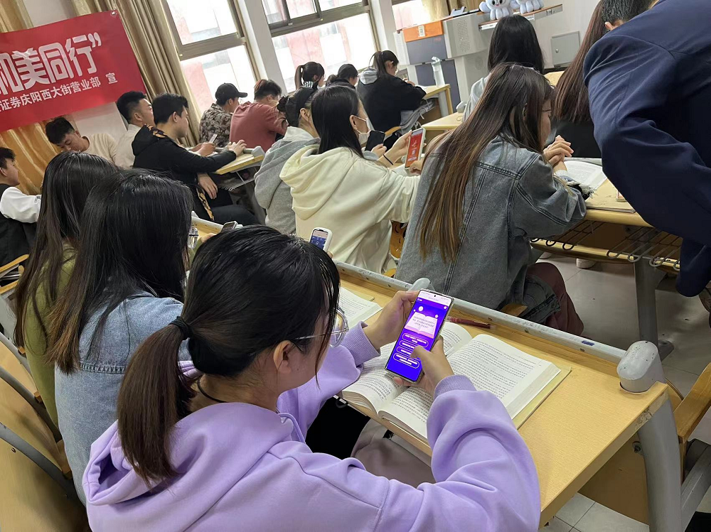 给学生介绍《股东来了》(2023)投资者权益知识竞赛活动背景及活动参与规则,现场指导学生扫码注册、参与竞赛答题丰富学生金融知识,拓宽学生获得金融知识渠道,提升学生学习积极性及金融知识获得感。