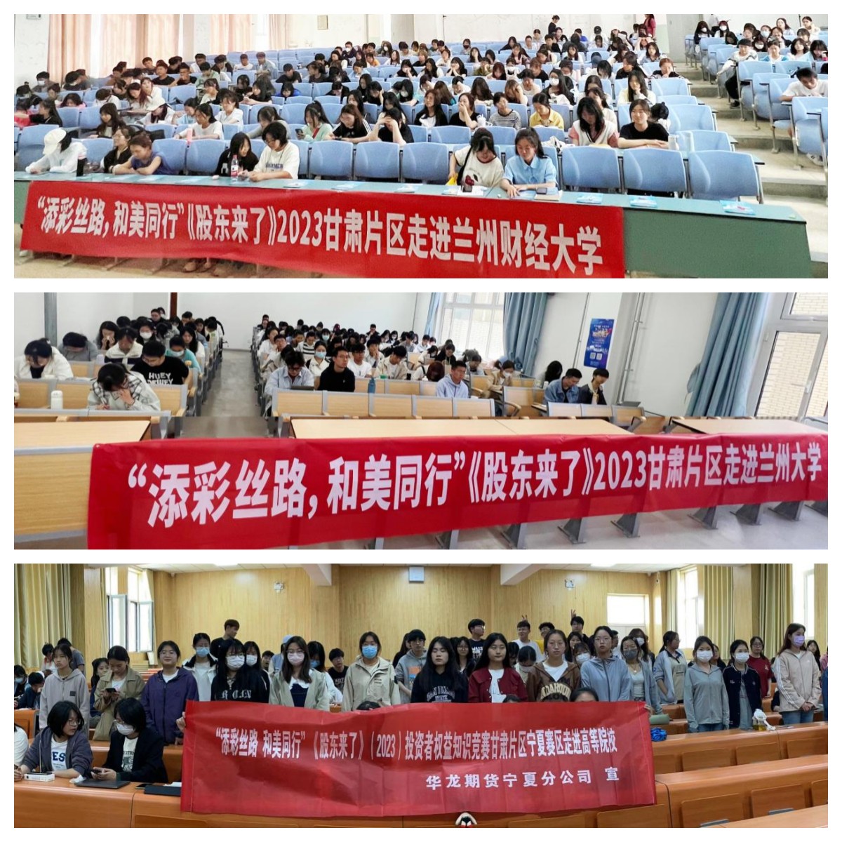 5月中旬,为进一步提升在校大学生的金融素养和金融知识水平,助力推进投资者教育纳入国民教育体系,华龙期货总部、华龙期货宁夏分公司,组织开展了“添彩丝路,和美同行”《股东来了》(2023)走进高校系列主题活动。期间分别在兰州大学、兰州财经大学、宁夏理工学院等多所高校开展了现场宣讲活动,为学生普及金融知识,远离各类金融违法违规陷阱?;疃ü悠嫡共ァ⑾殖≈督步?、投教知识问答等多种形式,有效引导学生为未来职业发展规划、学术研究方向打开新思路。