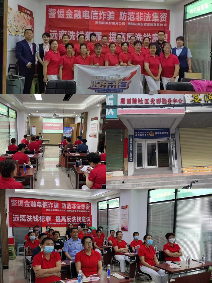 西部证券甘肃分公司走进兰州市雁西路社区,通过丰富的课程讲解金融知识,提醒社会公众警惕金融电信诈骗,防范非法集资,远离洗钱犯罪,提高反洗钱意识;通过《股东来了》(2023)竞赛活动,学知识、答题知权益,引导广大投资者及社会公众客观看待和理解全面实行股票发行注册制的意义和作用。