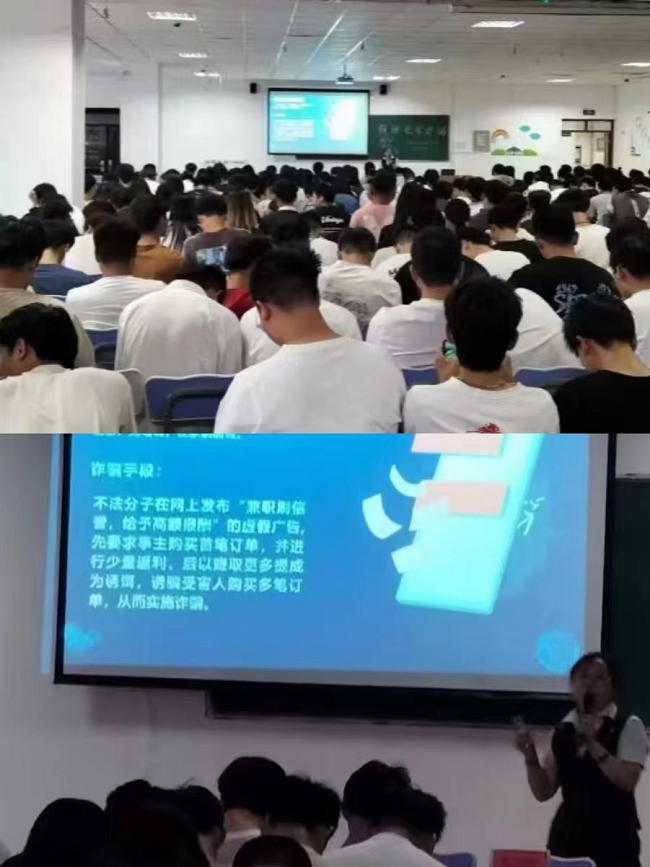 偌大的会议室里挤满了前来听课的学生,业务运营部总监许斌从发生在同学们身边的案例出发,从揭露当前电信诈骗分子的作案手段,识别常见电信诈骗的方法、防范措施、注意事项,一旦被骗,应该采取的补救措施、报案渠道,举报电信诈骗线索的方式等四个方面一一道来。最后,将《股东来了》(2023)参与方式及答题活动进行了详解。