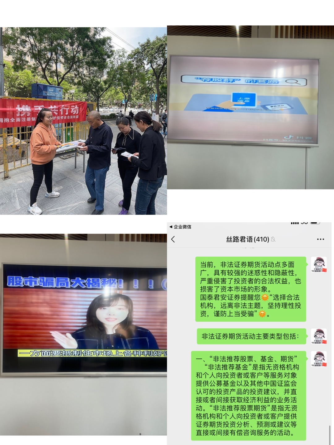 非法证券期货活动具有很强的欺骗性和隐蔽性,严重损害投资者利益,扰乱资本市场秩序,影响社会和谐稳定。为?;ね蹲收呷ㄒ?,提高投资者防范风险意识,国泰君安证券兰州东岗西路营业部积极组织开展以“深入贯彻党的二十大精神,发挥合法机构作用,抵制非法证券期货活动,减少投资者上当受骗”为主题的一系列防非宣传活动。