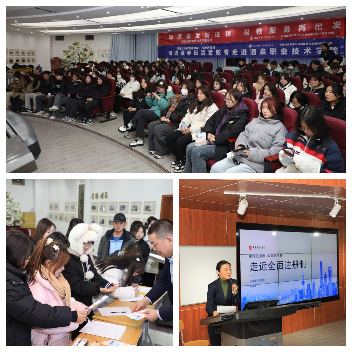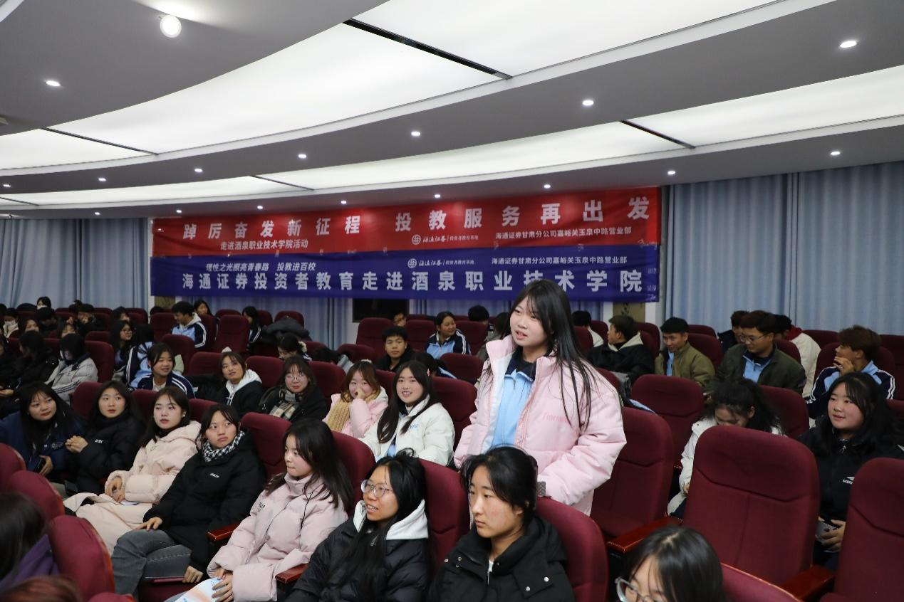 在活动中,嘉峪关营业部的讲师为酒泉职业技术学院的学生们带来了精彩的讲座。详细解读了全面注册制的背景、意义和影响,让学生们了解了我国资本市场改革的重要方向。同时,他们还通过生动的案例和深入浅出的讲解,让学生们了解了金融市场的运作原理和投资理财的基本知识。