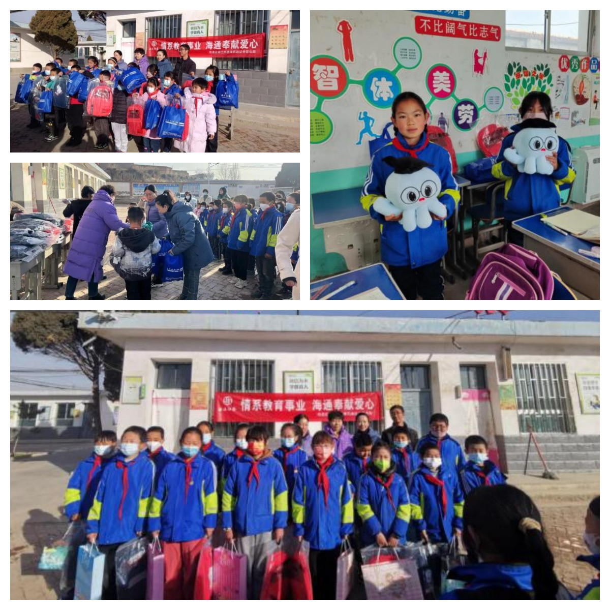 2023年11月28日,海通证券兰州西津西路营业部一行来到永登县红城镇徐家磨小学开展爱心助学捐赠活动。为孩子们送来书包、文具等学习用品和爱心礼物,寄语学生们好好读书,努力成才,以优异的成绩回报家乡、回馈社会。营业部一行与学校教职工、徐家磨村“两委”进行了座谈交流,王校长为我们讲述了孩子们的生活、学习状况,随后大家一同参观了学校的食堂、操场、图书室等。走进一间间教室,孩子们脸上洋溢着幸福的笑容,纷纷向我们展示自己崭新的书包和礼物,这些物资对孩子们来说不仅仅是物质上的帮助,更是精神上的鼓舞,激励着他们在成长的路上坚定信念、奋发有为。