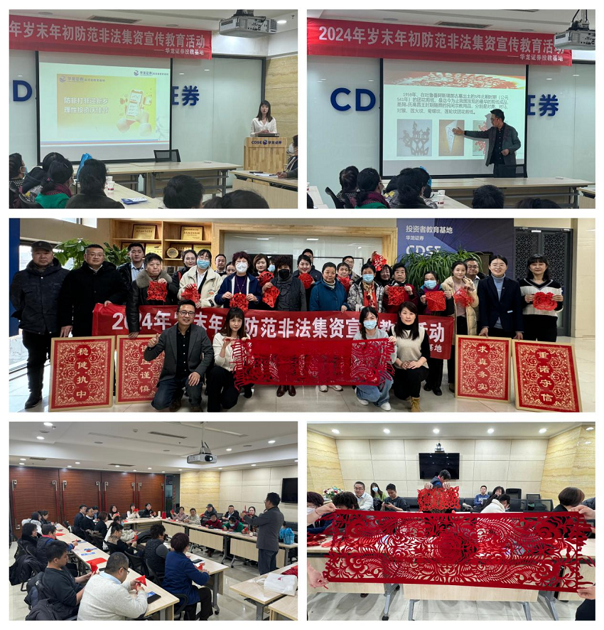 为进一步做好岁末年初防范非法集资宣传教育工作,切实做好新形势下防范和处置非法集资宣传教育工作,增强广大投资者对非法集资的防范意识和识别能力,2024年1月24日下午,华龙证券投教基地组织开展以“剪彩迎新岁,防非保安康”为主题的防范非法集资宣传教育活动。