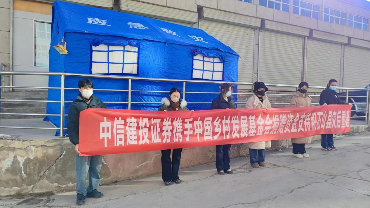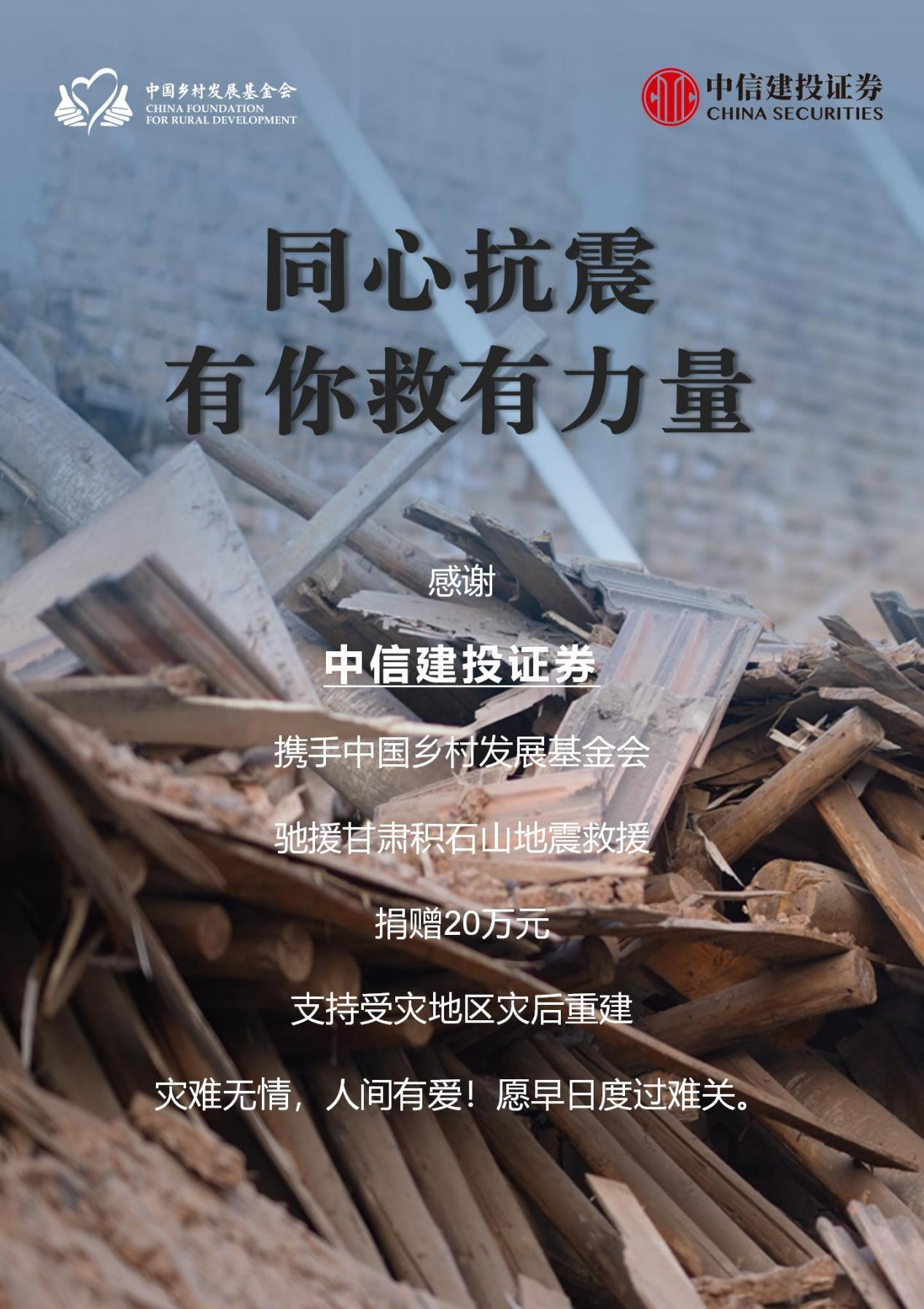 守望相助、共克时艰。中信建投证券甘肃分公司积极响应甘肃证券期货业协会倡议,迅速行动,多方联系了解灾情,考虑到积石山灾区目前相关工作重点已由救援工作转到受灾群众生活安置及灾后重建,中信建投证券通过中国乡村发展基金会捐赠20 万元,专项用于积石山县灾后重建项目,帮助群众尽快恢复生产生活。