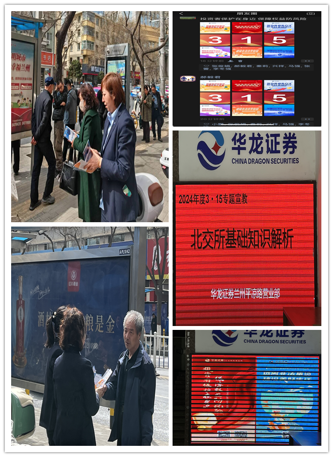 3月15日,营业部电子屏统一滚动播放权益?;と罩魈庑掏计徒鹑谥缎柿?,悬挂宣传横幅,营业部微信公众号推送“投资者?;ぴ谏肀?保障权益防风险”宣教电子画册及主题宣传口号内容,营业部员工走向现场客户,分发北交所新三板基础知识画册、适当性管理彩页、投资者权益?;ね疾岬刃滩牧?,提示防范非法证券活动、坚持知识更新、了解市场变化,交流非法证券危害案例和维权方式渠道,营造良好积极的3·15主题日宣教氛围。同时,营业部组织员工走进附近商圈、商户、街区开展宣教活动,进一步普及金融知识、警示欺诈陷阱、分享投资理念及北交所基础知识、新三板知识解析、适当性管理、非法证券活动案例解析等,包含注册制改革、新三板、北交所、反洗钱防范、防范假冒证券公司名义实施诈骗活动等主题,帮助投资者树立风险防范与维权?;ひ馐?,营业部以警示词条、案例解析等为基础,提示投资者认清合法机构,使用公司官方交易软件,牢记正确的执业资质查询渠道和方式,提高风险识别能力,远离欺诈陷阱。