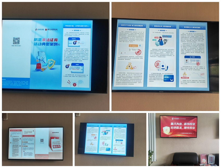二、通过营业部电视屏、企业微信客户群、员工微信朋友圈等互联网线上平台,向投资者和广大群众转发协会及公司制作的“防非打非、5.15投资者权益?;さ榷嘀中1ê统ね迹⒑筒シ帕恕氨苯凰姆婪斗欠ㄖと疃湫桶咐?、甄别非法证券活动,合规参与新三板市场倡议书、黑嘴“专家”莫轻信、投资分析要理性等很多宣传词条、5.15防非宣传月系列等很多内容,持续提示市场风险,扩大了本次宣传的覆盖面。