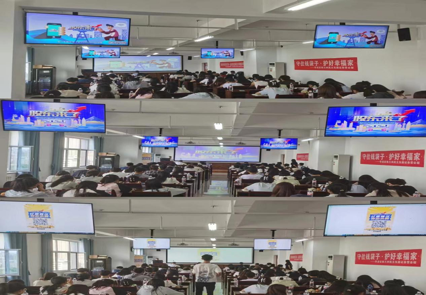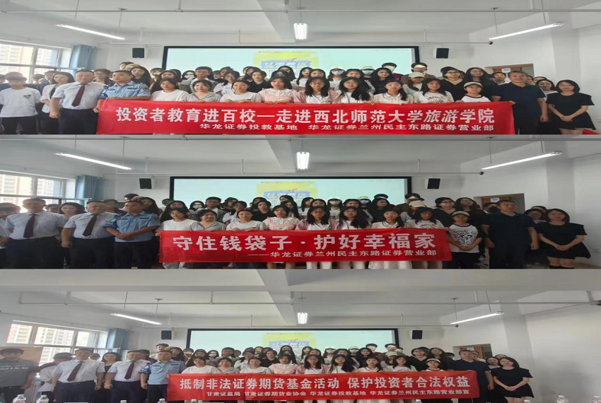 为积极响应中国证监会、中国证券业协会“推动投资者教育纳入国民教育体系”的号召,积极承担社会责任,充分发挥证券金融机构在提升国民金融素养工作中的主体作用,贯彻落实投资者?;すぷ?,华龙证券兰州民主东路营业部开展了以“防范非法集资,远离金融诈骗”为主题的“投资者教育进百?!被疃?。西北师范大学旅游学院110余名师生参加本次活动。