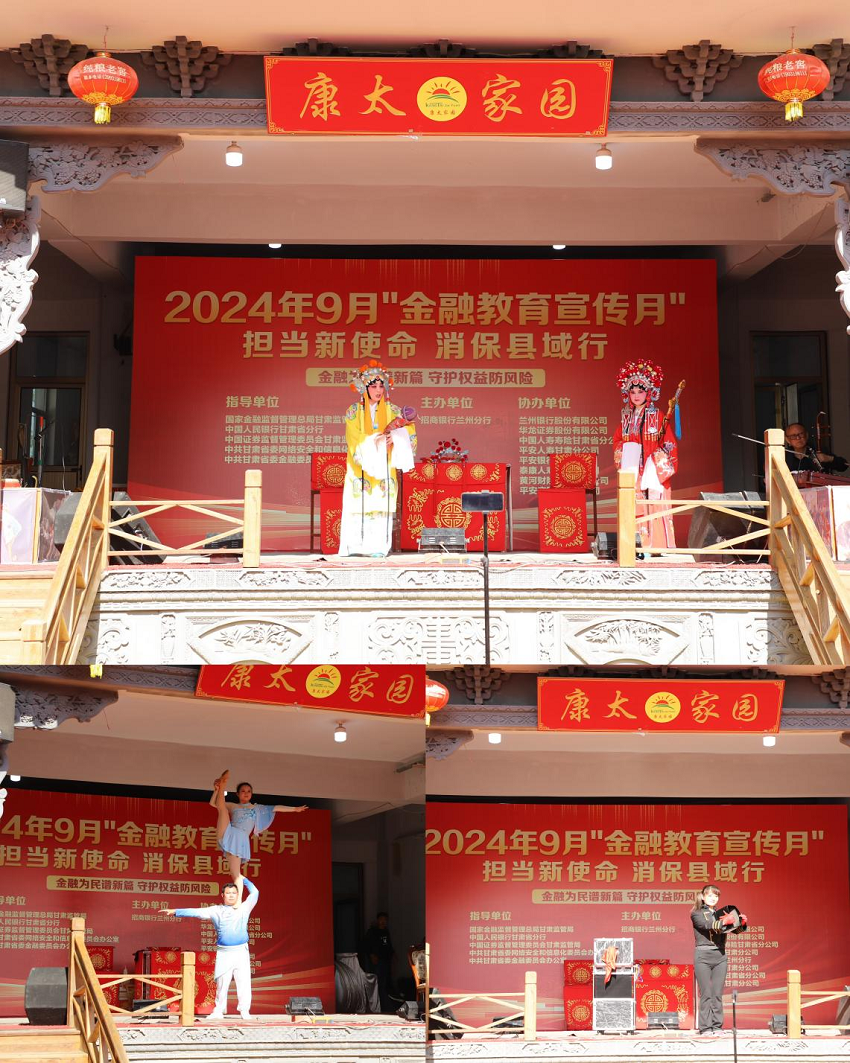 九月的榆中,居民沉浸在丰收的喜悦里。为提升县域居民的金融素养和风险防范意识,在国家金融监督管理总局甘肃监管局、中国证券监督管理委员会甘肃监管局、甘肃证券期货业协会的指导下,9月23日,华龙证券投教基地、兰州七里河证券营业部、榆中栖云北路营业部联合主办方招商银行兰州分行等8家金融机构,以“担当新使命,消保县域行”为主题,走进榆中县康太家园开展投教集中宣传活动。本次活动结合传统文化戏曲表演等丰富多彩的形式,将金融知识及消费者权益?;だ砟钌钊氪ブ粱忝裰谏肀撸镏忝裰凇把Ы鹑?、懂金融、信金融、用金融”。