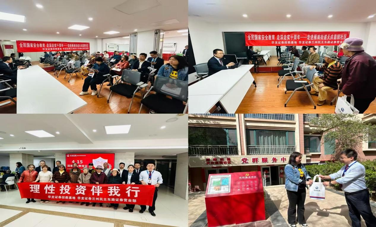 2025年4月15日是我国第十个全民国家安全教育日,为加强《国家安全法》的宣传普及,提升全民国家安全意识,华龙证券兰州民主东路营业部于4月15日在雁南街道天庆嘉园社区组织开展了“全民国家安全教育,走深走实十周年”的主题宣传教育活动,向辖区居民普及国家安全和金融安全知识,提高广大群众金融素养和风险防范意识。