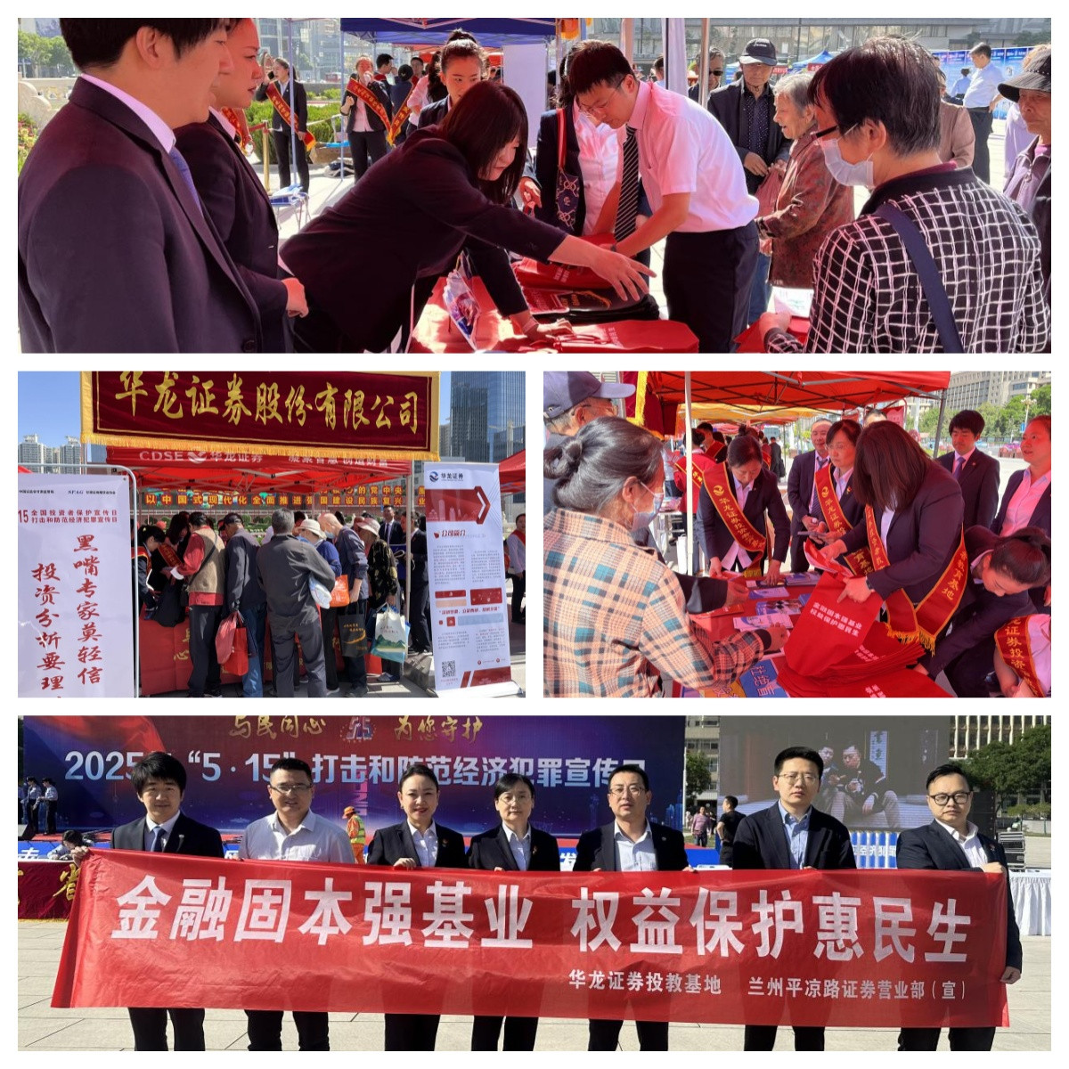 为切实增强投资者风险防范意识,揭示经济、金融犯罪活动危害,提升金融素养,5月15日,华龙证券兰州平凉路营业部响应公司号召,参与省高院、省检察院、省公安厅等单位联合开展的主题为“与民同心 为您守护”的“5·15打击和防范经济犯罪宣传日”活动,与此同时,证券期货行业“5·15全国投资者?;ば铡敝魈饣疃怖∧?,通过设立宣传台、现场交流解答、观看警示片和警示文化墙等形式,为投资者教育与权益?;ぴ偬硇露堋?/span>