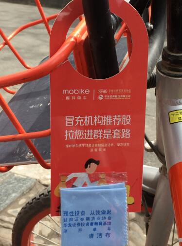 4月25日,1万辆身挂小红牌的摩拜单车出现在甘肃省会兰州街头。甘肃证券期货协会、华龙证券投资者教育基地携手摩拜单车创新投教新形式,小红牌上印有各种言简意赅的宣传用语,如“产品介绍要看清 谨防误导和误听”、“冒充机构推荐股 拉您进群是套路 ”、“巨额收益是假象 高息骗钱是本质”、“一夜暴富是幻想 忽视风险易受伤”、“庞氏骗局不复杂 离谱收益??浯?amp;rdquo;等,真正将投教活动做得生动活泼、与时俱进,随处可见、随时可见。
